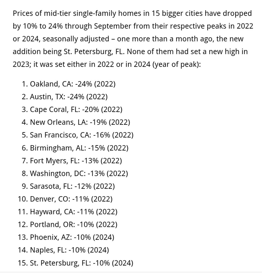 而Wolfstree.com最近公布的独栋屋价格从2022年峰值下降超两位数的城市中也体现这一趋势,南部和西部是房价下跌的重灾区。