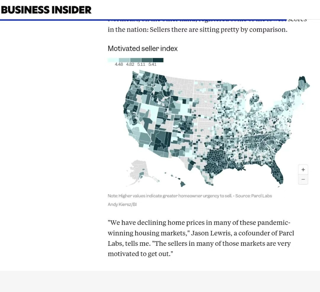 Business Insider 公布了调研机构Parcl Labs发布的**“卖家积极指数”(Motivated Sellers Index),下图颜色越深代表“卖家”越想尽早脱手。**