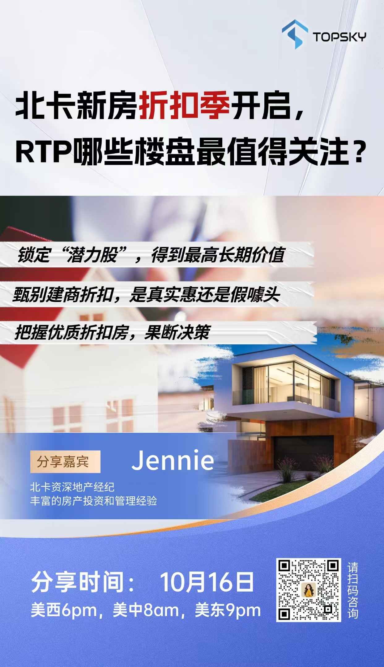 主题:北卡新房折扣季开启,RTP哪些楼盘最值得关注? 时间:10月16日(周四) 美西晚6点 | 美中早8点 | 美东晚9点