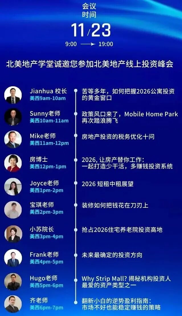 11月22-23日 美西9:00-19:00 线上投资论坛,获取2026年房地产市场前瞻性报告