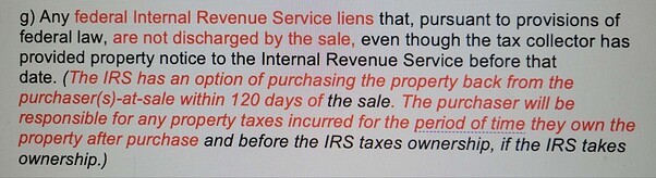 多谢!@Yan-1-15-洛杉矶 好像跟我理解的意思差不多 就是说如果irs在120天内 没有回购房屋,买家就需要交老屋主在irs的欠税 对吧?