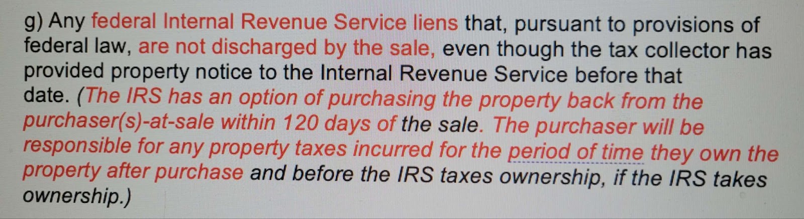 IRS 在出售后 120 天内有权回购该房产,即赎回权(Right of Redemption)。如果 IRS 选择行使该权利,买家必须将房产转让给 IRS,并且通常只能收回购房款,而无法获得额外的补偿或利润。
