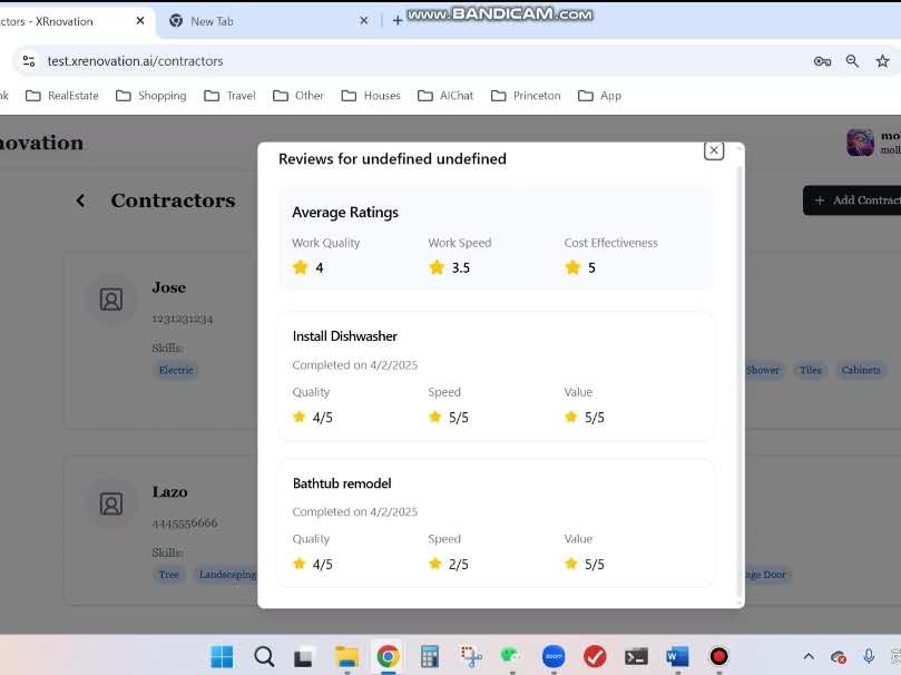 目前每个人只能看到自己的reviews,因为contractor信息也是自己输入的嘛。等用的人多了,我们考虑搞一个contractor market,你就可以搜索contractor,market上的contractor就显示所有用户给的review平均值了。