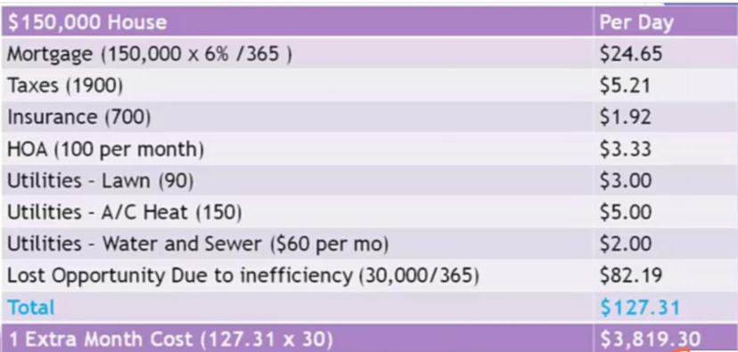 鉴于目前美国房产市场火热,合同工都很忙。找合同工干活,一预约,就预约到几个月去了。可是,你的房子不等人。放一天就是一天的钱。一个15万的房子,多放一天,损失差不多就是120多美元,一个月就是3,800多美元(见下图)。