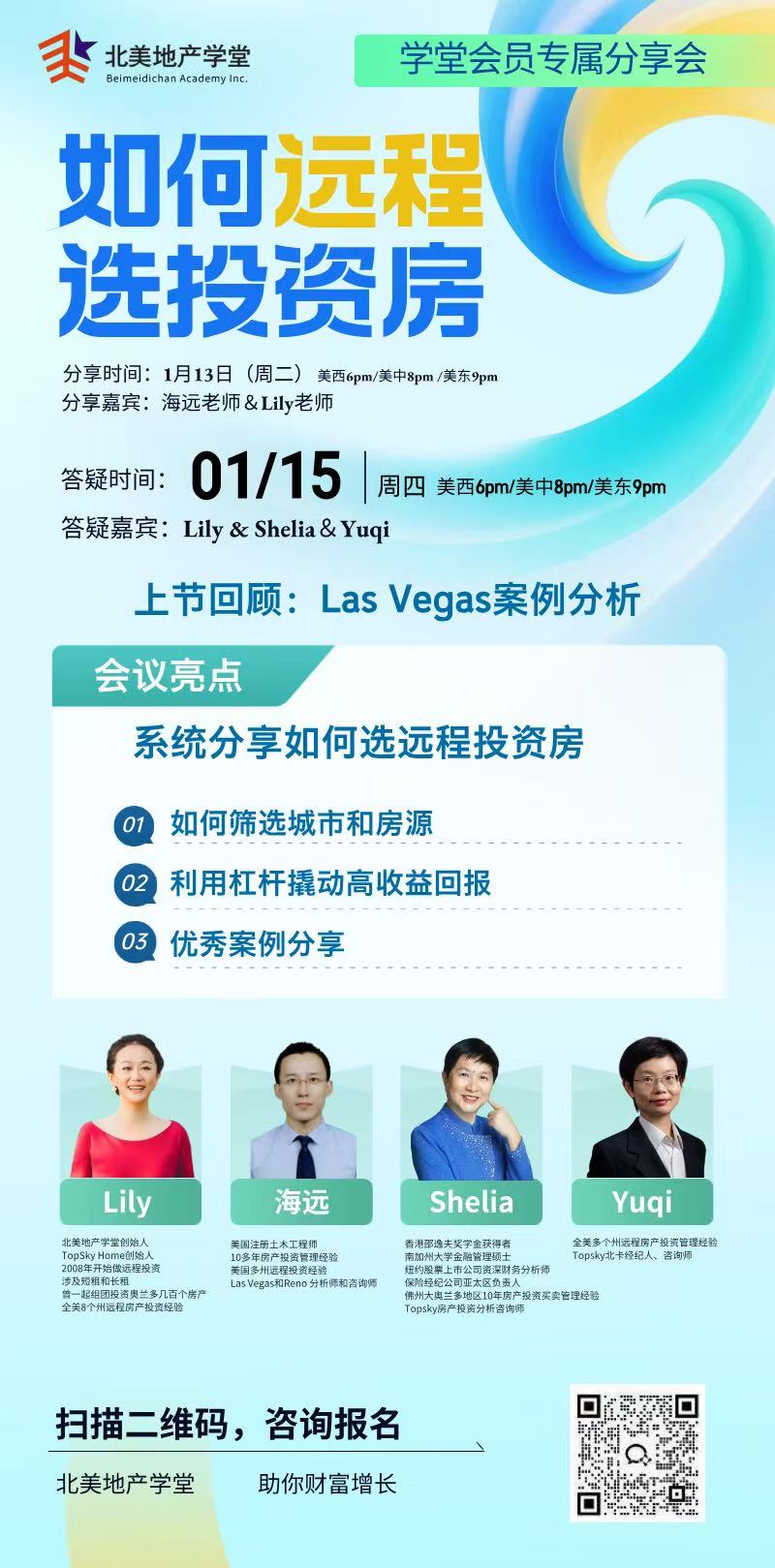 北美地产学堂特设1月15日答疑专场(美西6pm/美中8pm/美东9pm),由Lily老师携手Shelia、Yuqi老师组成答疑天团,针对远程选投资房的实操难题一一拆解: